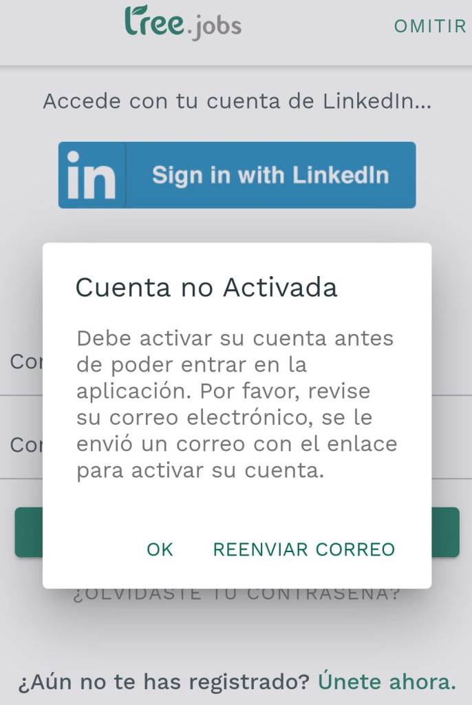 Si tienes Android y te has registrado a través de LinkedIn no necesitas verificar tu correo, ya que ese correo se ha verificado anteriormente con la aplicación de LinkedIn. Si no te llega, revisa las carpetas de spam, social… Si estás seguro de que no te ha llegado, introduce tu correo y contraseña al inicio de la aplicación y pulsa la opción de reenviar correo.